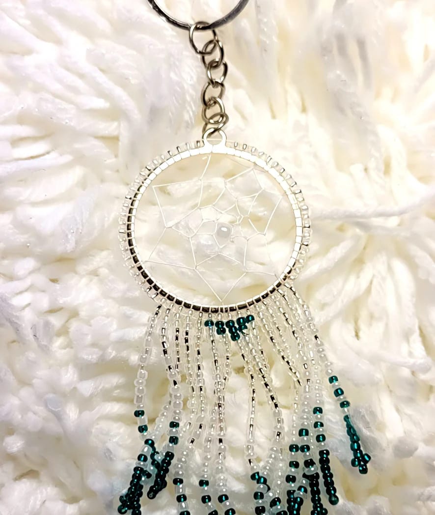 Beaded dreamcatcher keychain feature a small hoop with web like pattern