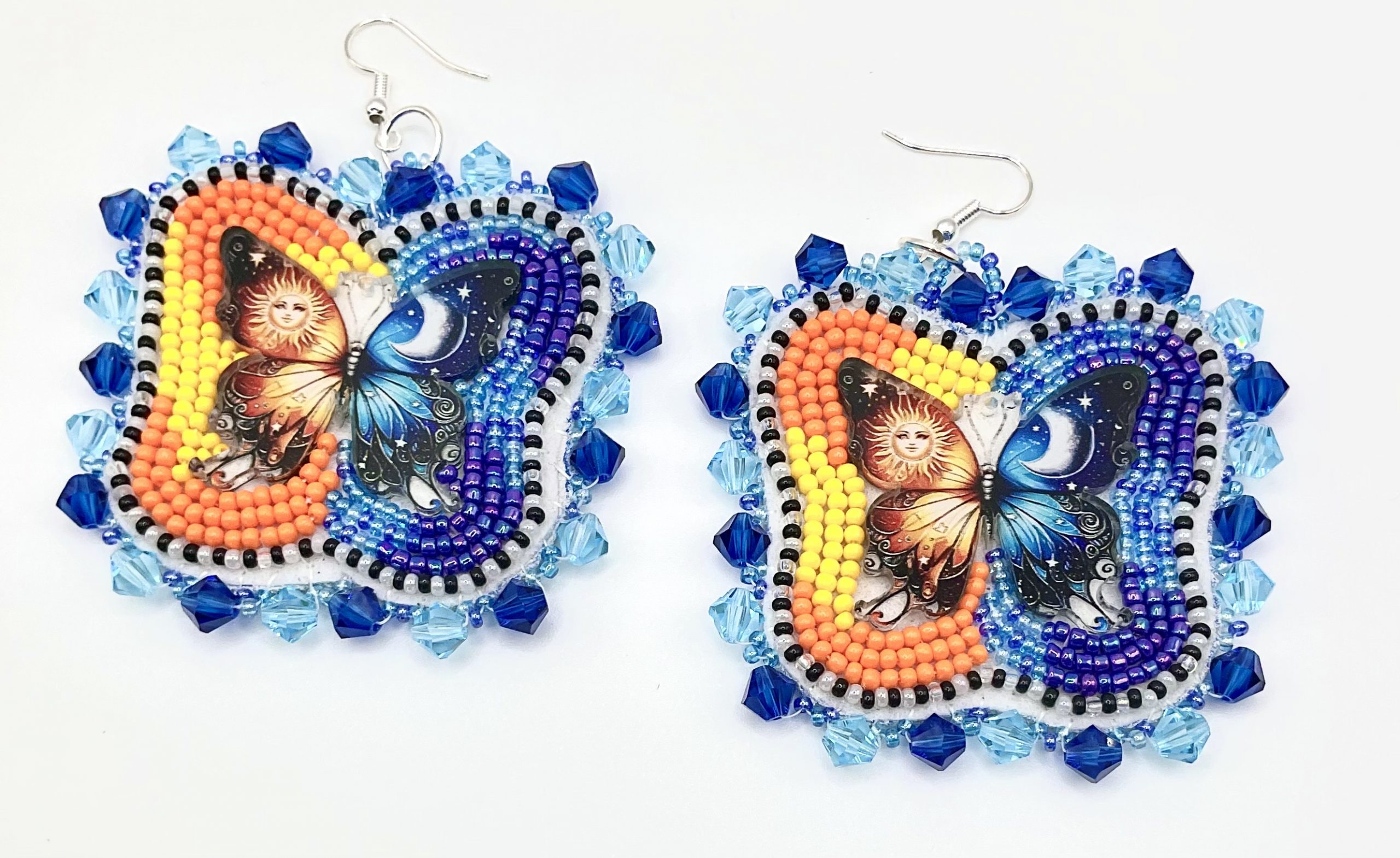Embrace balance, beauty, and transformation with these intricately handcrafted butterfly earrings. Each pair features a striking dual‑theme design: one wing glowing with warm sun tones, the other shimmering with cool moonlit hues. Vibrant beadwork in yellows, oranges, blues, and purples brings the day‑and‑night contrast to life, while sparkling crystal accents frame the butterfly shape with radiant dimension.