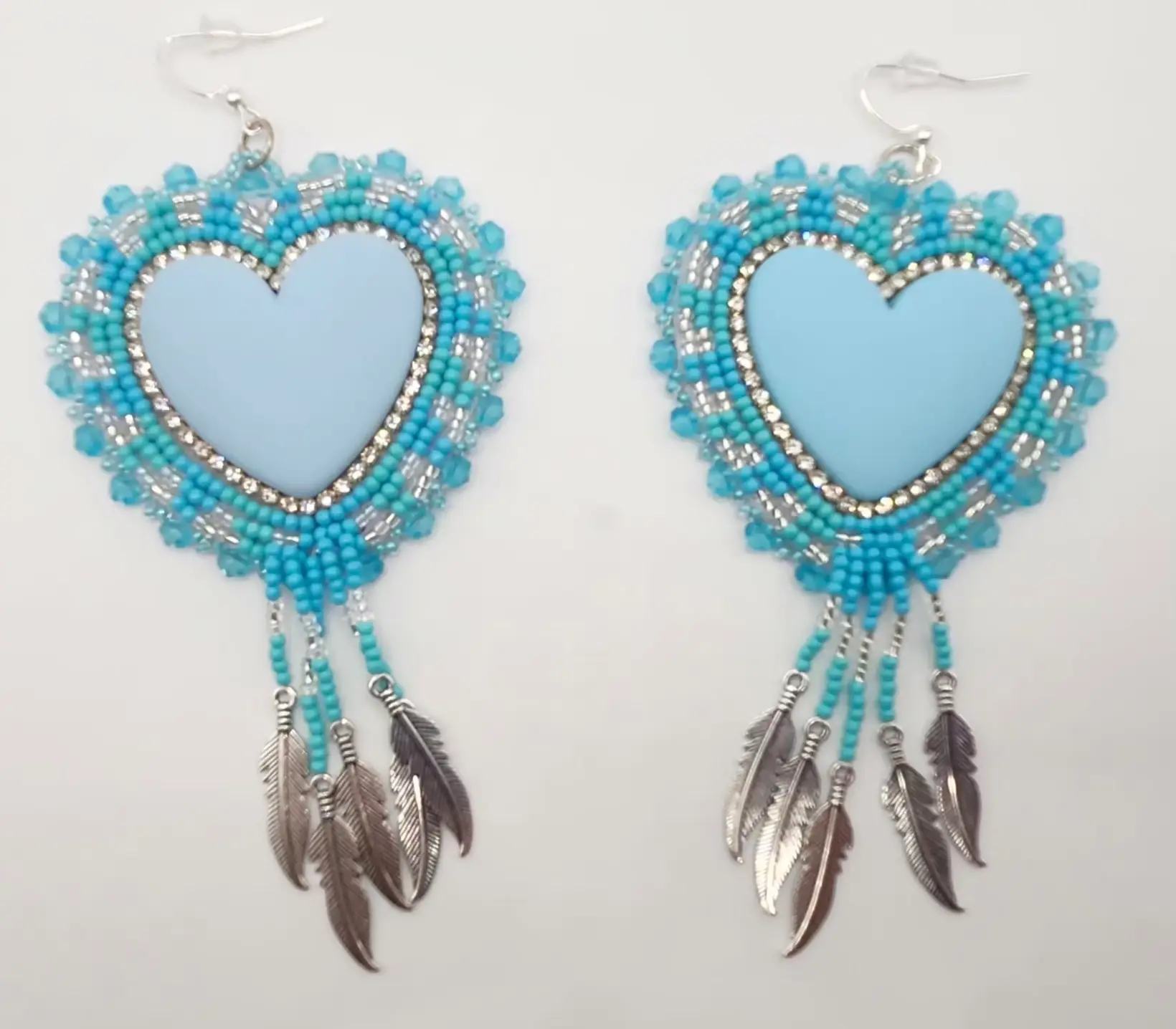 At their core lies a light blue heart-shaped cabochon, polished to a smooth finish that reflects soft light like a calm sky over water. This centerpiece is embraced by meticulous beadwork—tiny glass beads in shimmering sapphire and icy silver hues form a halo that’s both delicate and eye-catching.