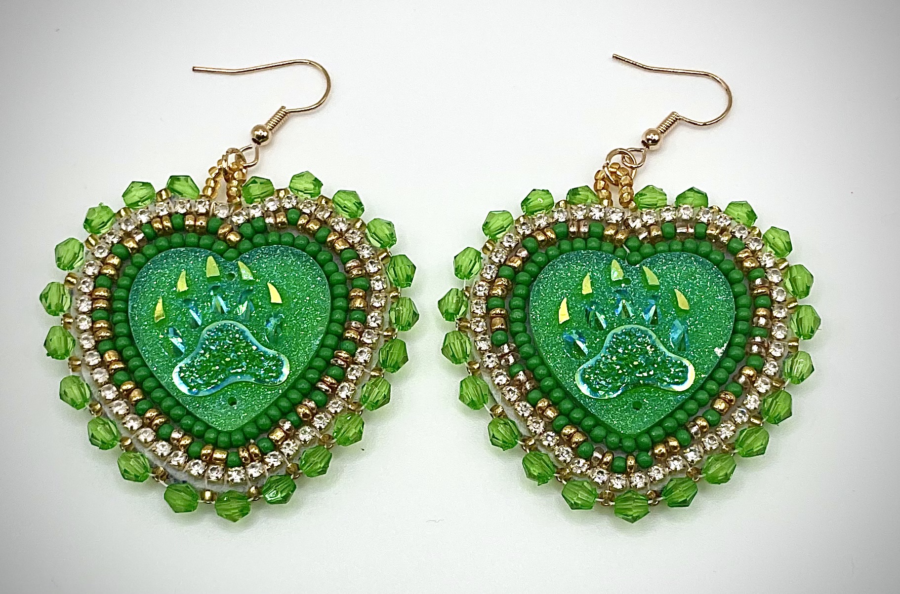 • Layered beadwork in rich green, gold, and clear tones